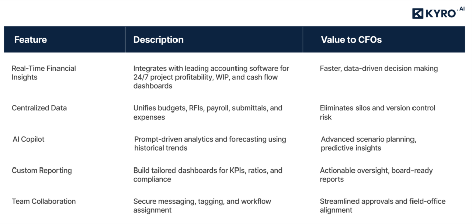 Construction finance managers are at the heart of every contractor’s profitability. But with so many manual processes and disconnected systems, the job has become harder than it needs to be. KYRO AI Copilot changes that. By putting real-time insights and automation at their fingertips, CFMs can spend less time on admin and more time driving strategic decisions that keep contractors profitable.