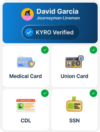 KYRO Verified requires: Medical Card, SSN, UTN, CDL or Driver's License or State ID, Voided Check, W-4 Form, I-9 Form, Direct Deposit Authorization, and Policy Form acknowledgement. Documents are uploaded once, validated automatically, and monitored for expiration, so the lineman is alerted before credentials lapse rather than discovering the issue at de-rostering.