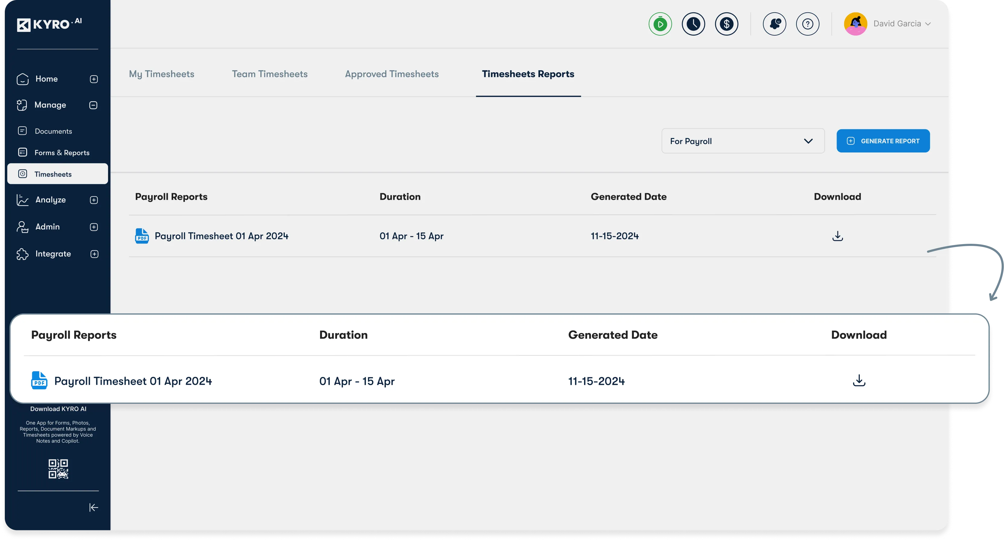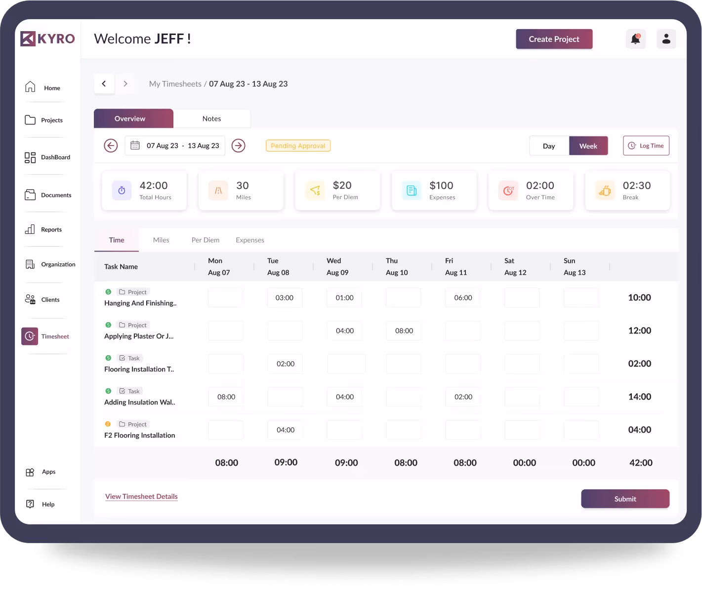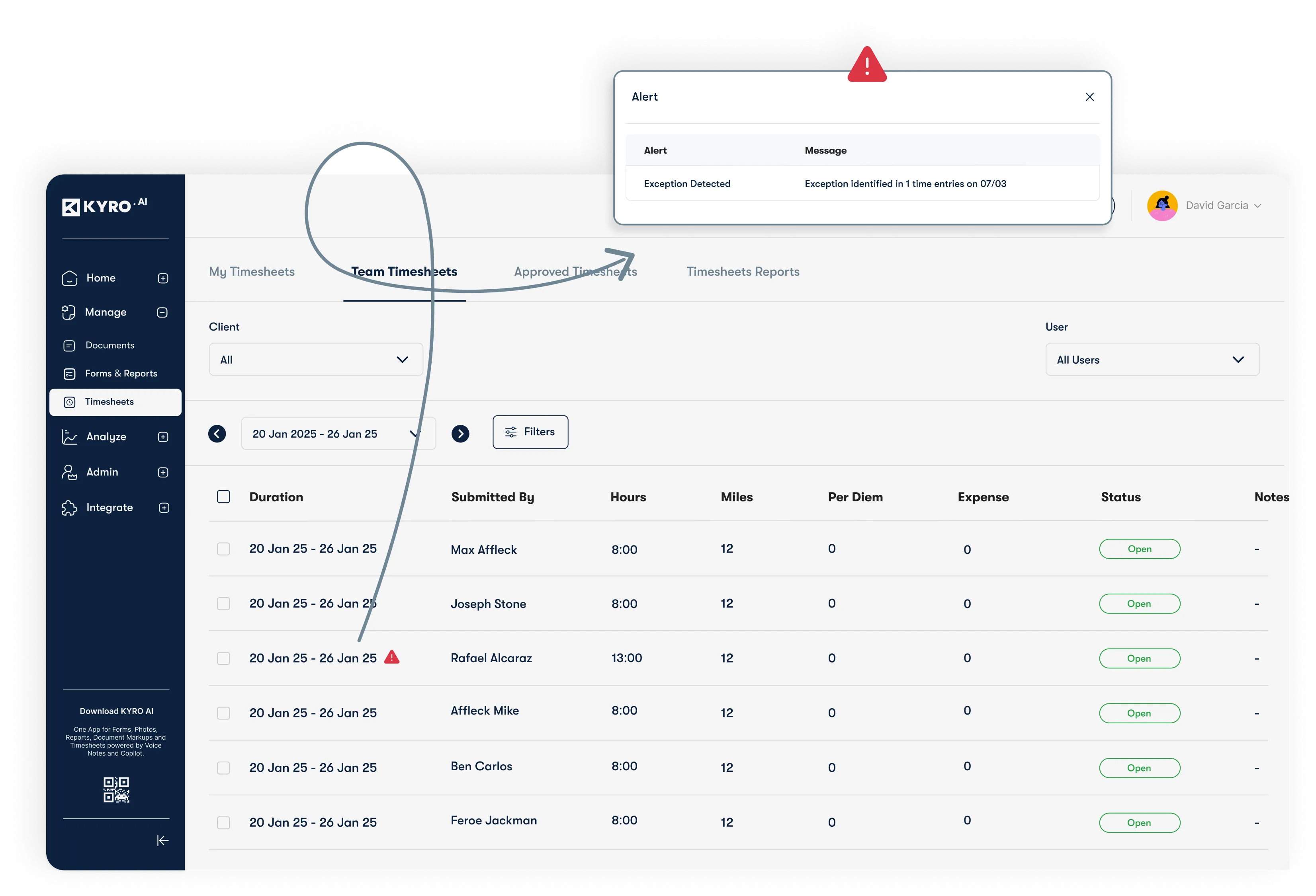 Field crews can log time quickly and easily from the field, and any anomalies are immediately flagged by KYRO's AI which leads to quicker resolution, quicker billing, and improved cash flow.