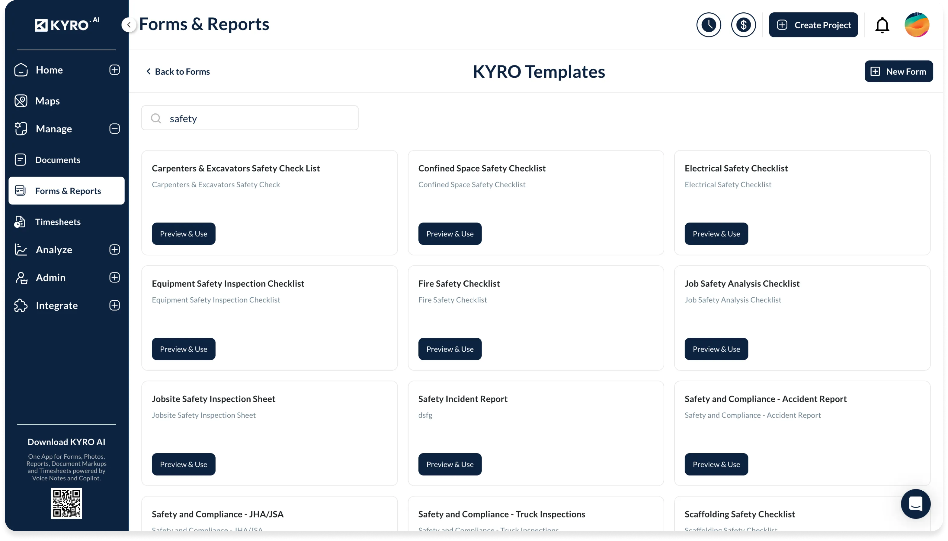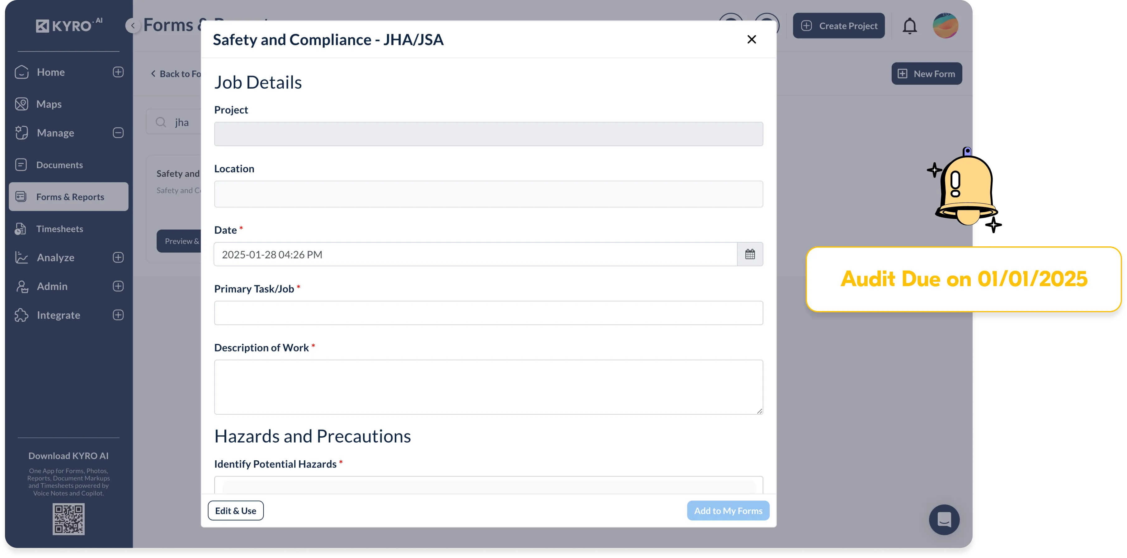 Leverage KYRO AI’s AI Copilot for in-depth analysis of your safety processes. Identify high-incident job sites, uncover underlying issues, and access historical data to implement corrective actions. Obtain actionable insights with simple prompts to drive ongoing safety improvements.