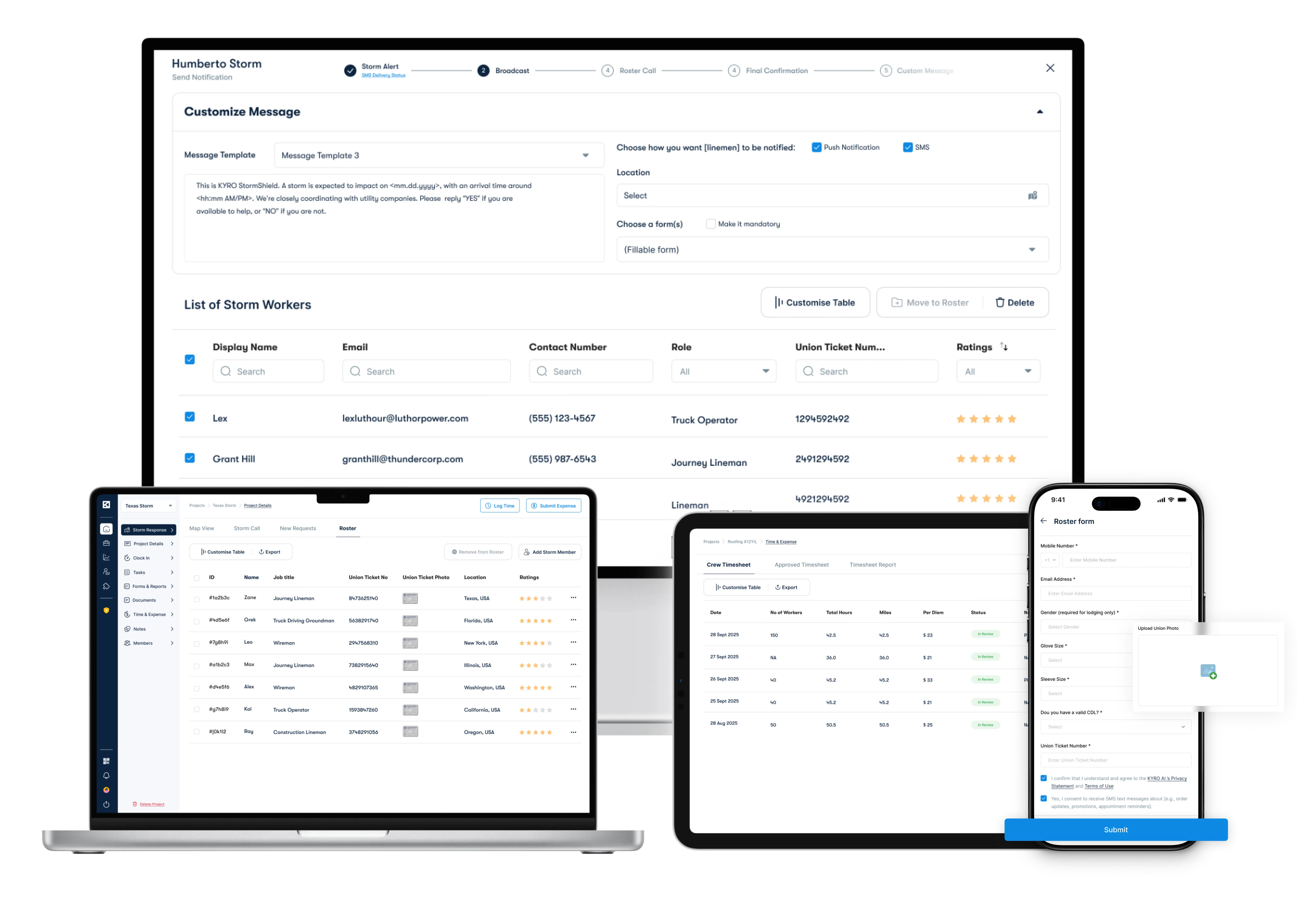 Quickly assign and onboard linemen or field crews within a defined radius. KYRO AI provides real-time visibility into every resource, helping you balance manpower and equipment efficiently across multiple storm sites.