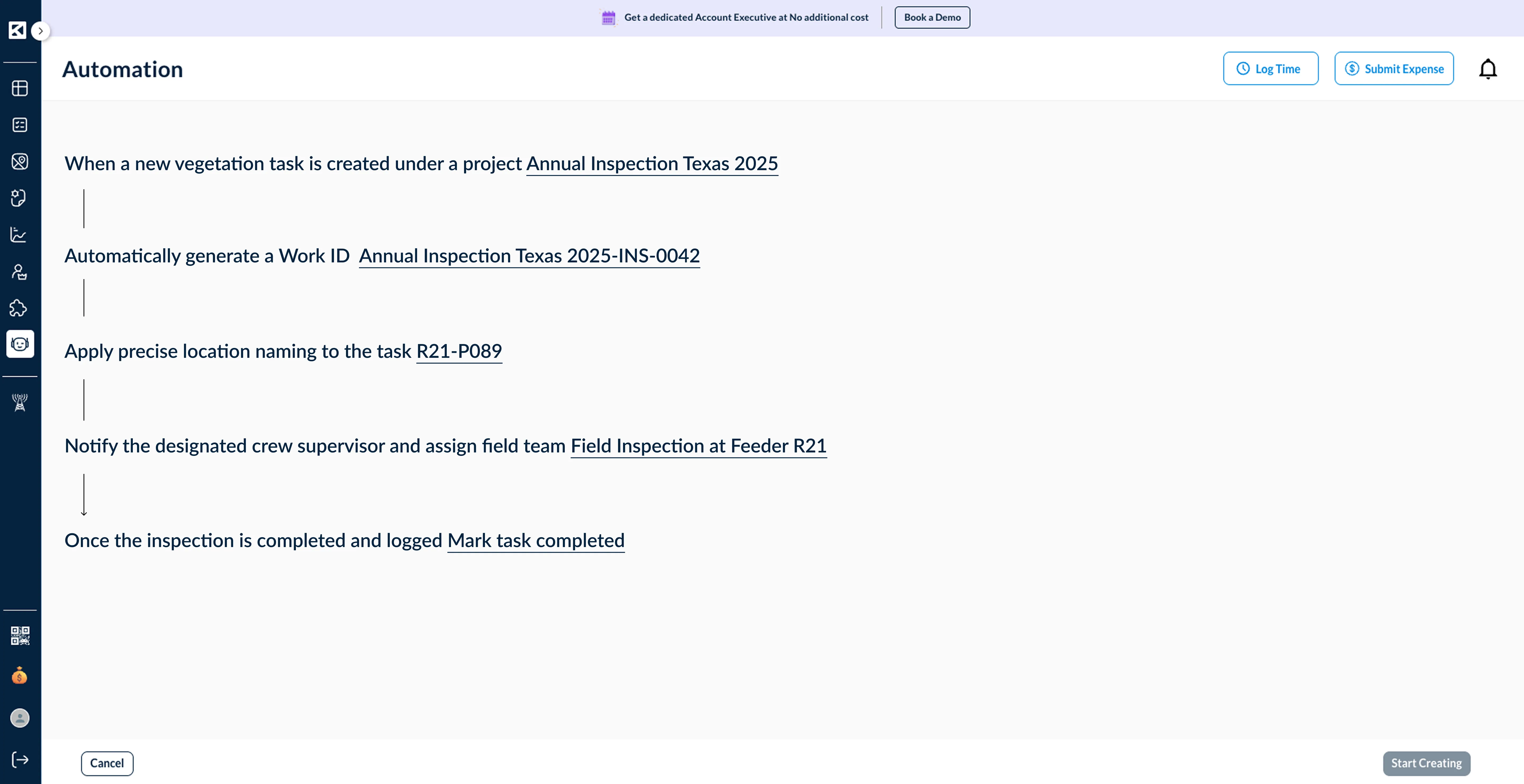 Create workflows that match your specific vegetation goals. Whether it’s trimming near powerlines, clearing rights-of-way, or inspecting structures, every task follows the right sequence with zero guesswork.