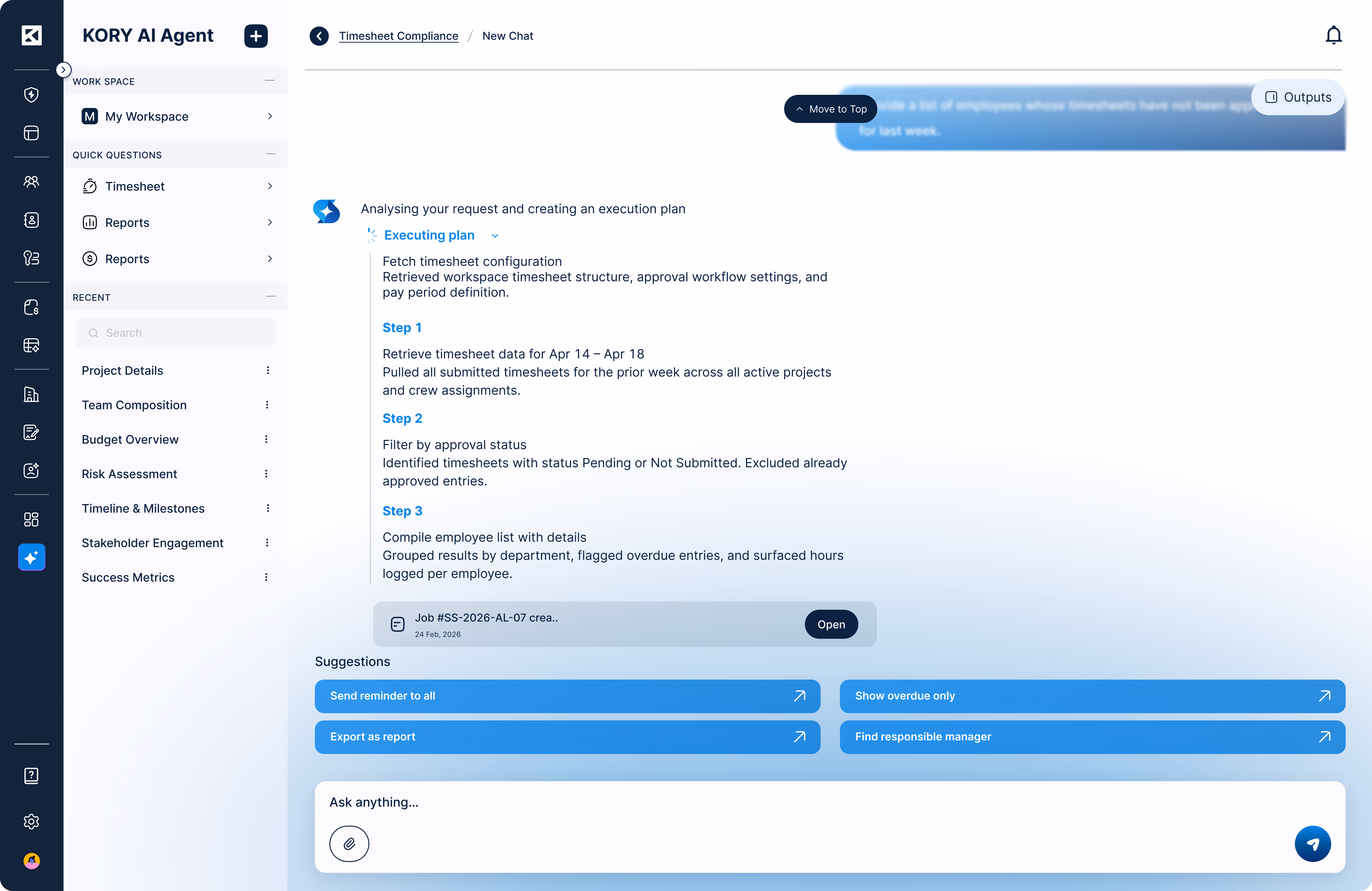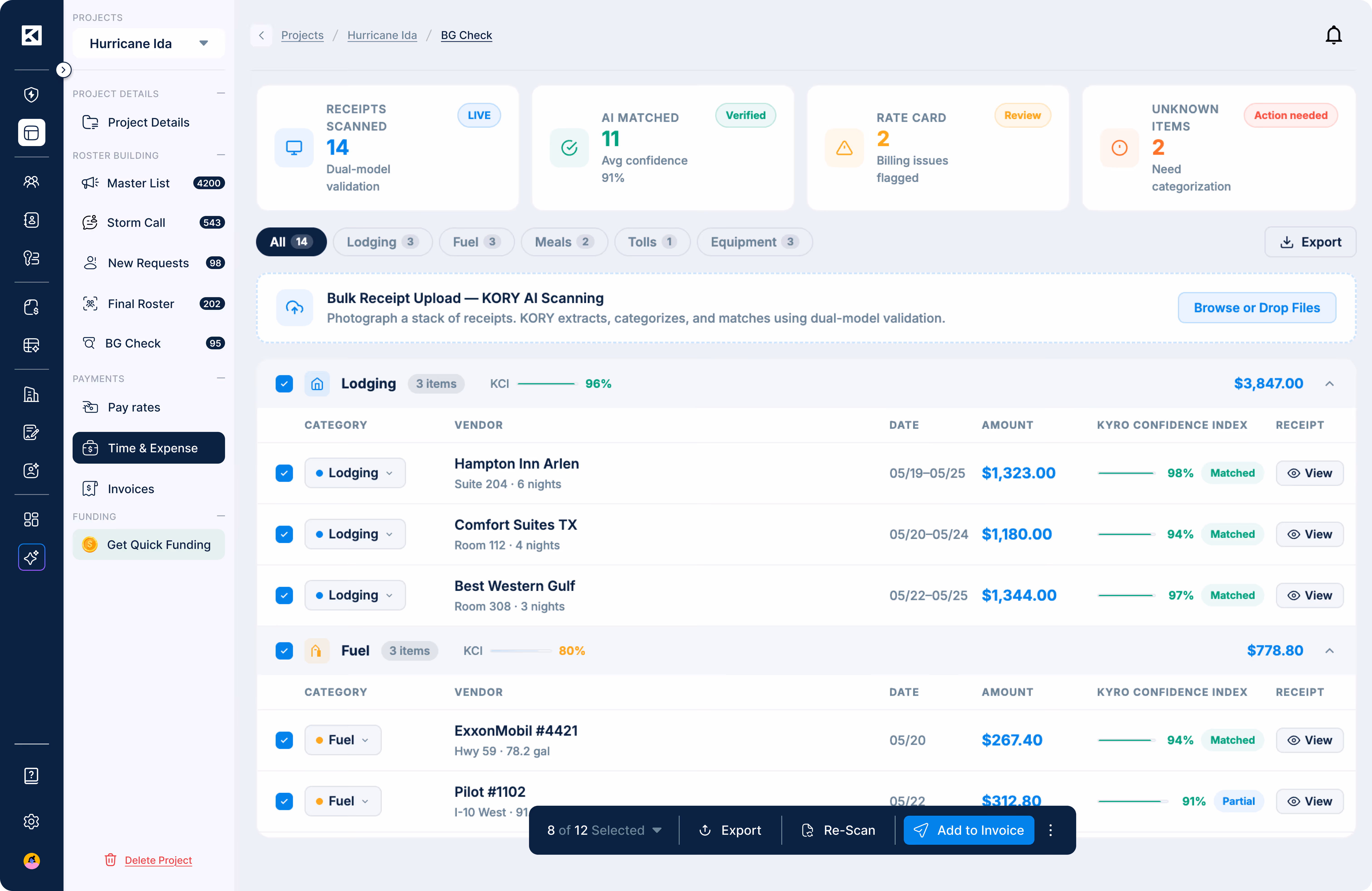 AI Timesheet & Equipment Check— KORY cross-checks submitted timesheets against rate cards and equipment allocations before invoices are generated.